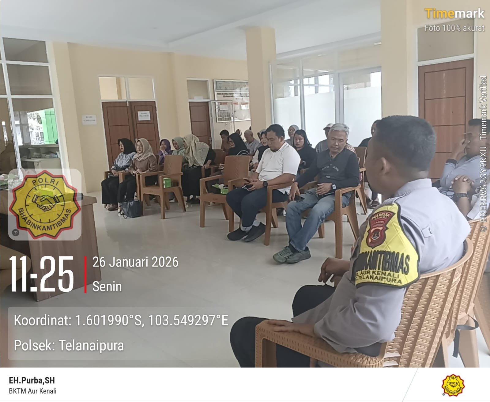 Jambi. (Benuajambi.com)-Bhabinkamtibmas Kelurahan Aur Kenali Polsek Telanaipura, AIPDA Elon Hartarto Purba, S.H., menghadiri undangan musyawarah yang diselenggarakan oleh Kantor Lurah Aur Kenali terkait permasalahan Pemutusan Hubungan Usaha (PHU) Pangkalan Gas LPG 3 Kg milik Ibu Kristina Sundari, bertempat di Aula Kantor Lurah Aur Kenali, Kecamatan Telanaipura, Kota Jambi. Senin (26/1/2026).