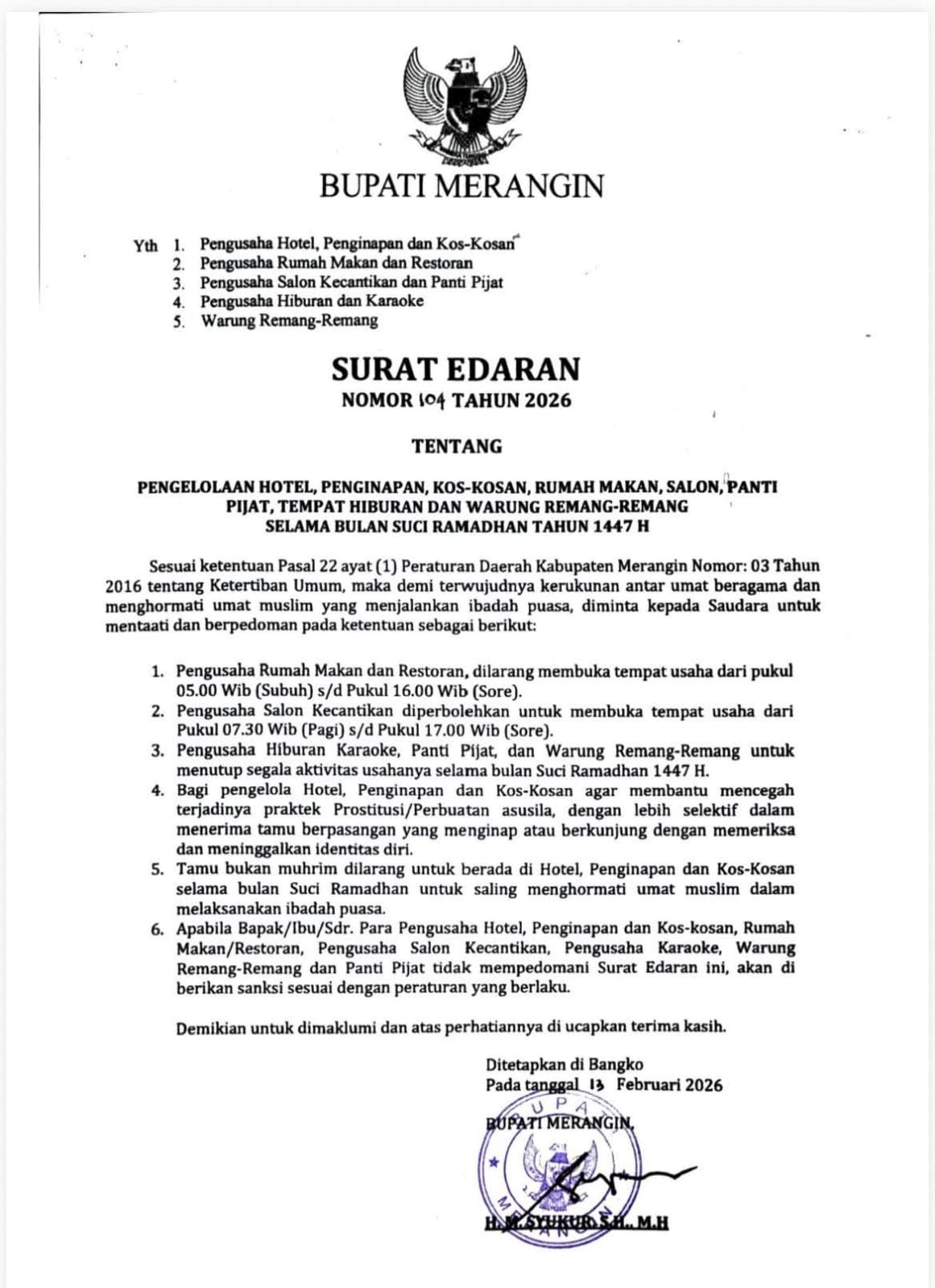 MERANGIN, BENUAJAMBI.COM – Pemerintah Kabupaten Merangin resmi mengeluarkan aturan ketat terkait aktivitas ekonomi dan hiburan selama bulan suci Ramadan 1447 H. Melalui Surat Edaran (SE) Nomor 104 Tahun 2026, Bupati Merangin, M. Syukur, S.H., M.H., menginstruksikan penutupan total bagi sejumlah tempat hiburan dan pembatasan jam operasional bagi pelaku usaha kuliner.