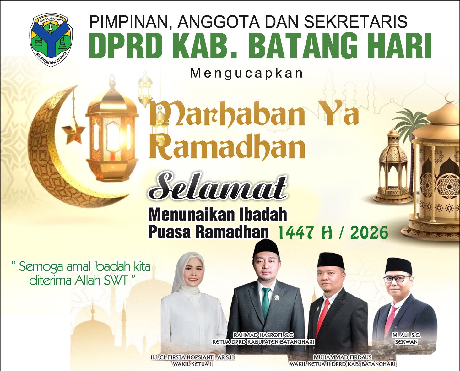 BATANGHARI.(Benuajambi.com)-Ketua dan segenap Anggota DPRD Kabupaten Batanghari, Rahmad Hasrofi, SE, menyampaikan ucapan selamat menunaikan ibadah puasa Ramadan 1447 Hijriah / 2026 Masehi kepada seluruh umat Muslim, khususnya masyarakat di Kabupaten Batanghari.