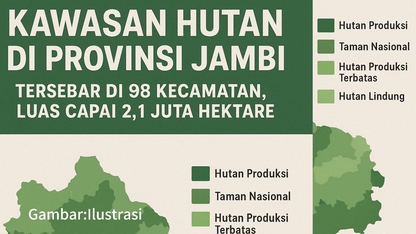 JAMBI (Benuanews.com) – Data terbaru dari Kementerian Lingkungan Hidup dan Kehutanan (KLHK) menunjukkan, kawasan hutan di Provinsi Jambi hingga tahun 2020 tercatat seluas ±2.123.430 hektare atau 43,27 persen dari total wilayah provinsi. Kawasan ini tersebar di hampir seluruh kabupaten/kota, meliputi 98 kecamatan.