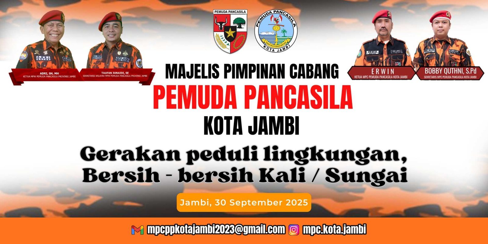 JAMBI (Benuajambi.com) – Dalam rangka menyemarakkan Hari Ulang Tahun Pemuda Pancasila ke-66, peringatan Hari Sumpah Pemuda ke-97, serta menyambut Musyawarah Besar XI, Majelis Pimpinan Nasional (MPN) Pemuda Pancasila menginstruksikan seluruh jajaran organisasi, mulai dari Majelis Pimpinan Wilayah (MPW) hingga tingkat basis, untuk melaksanakan program khusus bersih-bersih kali/sungai pada 30 September 2025 di daerah masing-masing. Kegiatan ini sebagai bentuk kepedulian Pemuda Pancasila terhadap pelestarian lingkungan.