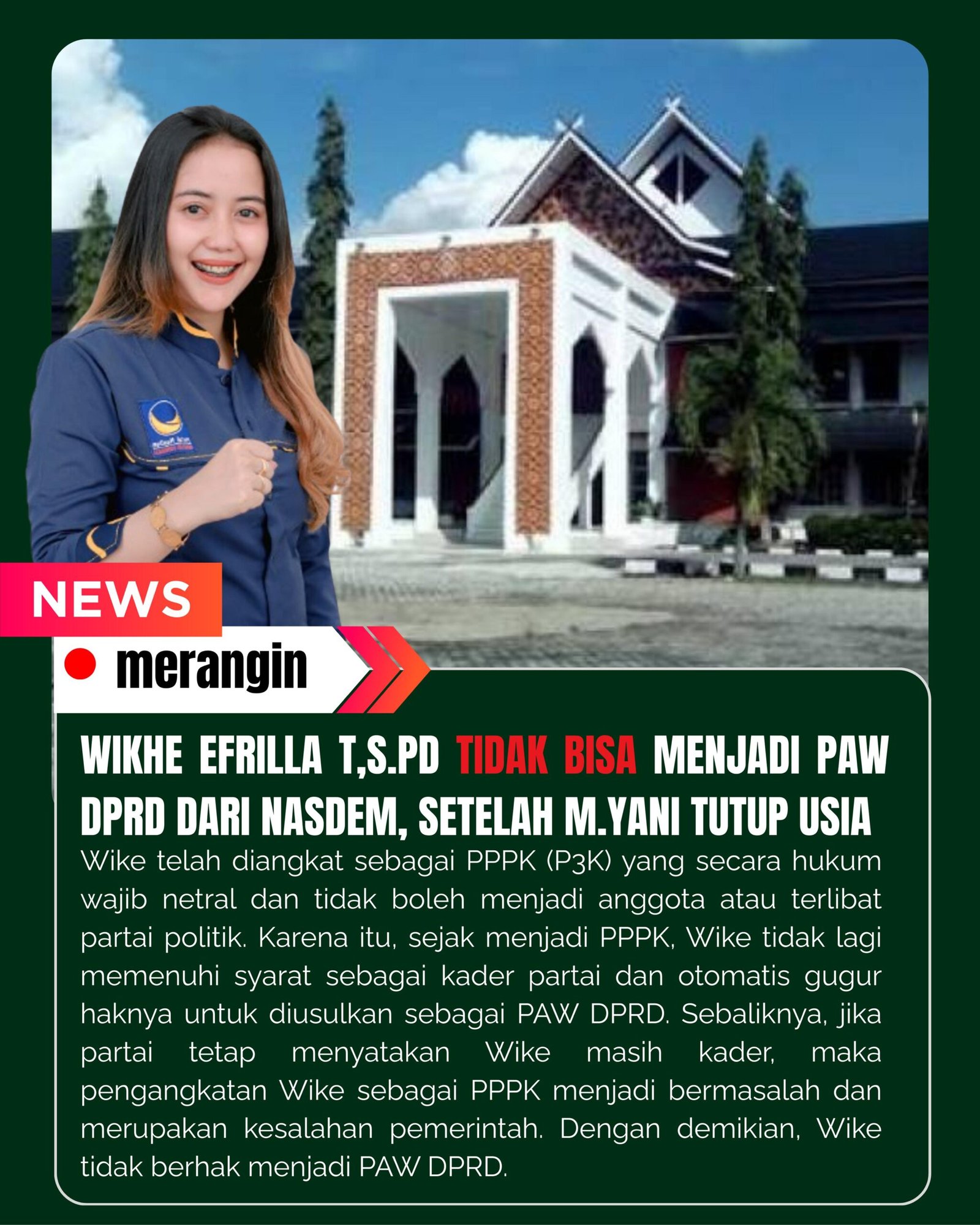 Secara hukum, sejak pengangkatan sebagai PPPK tersebut, Wike secara otomatis dianggap tidak lagi memenuhi syarat sebagai kader partai politik. Status ganda sebagai abdi negara dan anggota partai adalah hal yang mustahil secara regulasi. Hal ini mengakibatkan haknya untuk diusulkan dalam proses PAW DPRD gugur demi hukum.