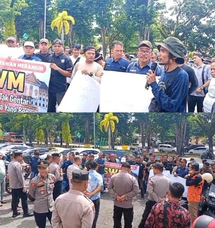 Merangin, Benuajambi.com – Puluhan wartawan yang tergabung dalam Solidaritas Wartawan Merangin pada Kamis (13/11/2025) menggelar aksi demonstrasi di halaman Mapolres Merangin. Aksi tersebut merupakan bentuk protes atas dugaan tindakan intimidasi yang dilakukan oleh sejumlah preman bayaran di lokasi tambang emas ilegal di kawasan Dam Betuk, Desa Tambang Baru, Kecamatan Tabir Lintas, Kabupaten Merangin, pada 7 November 2025 lalu.