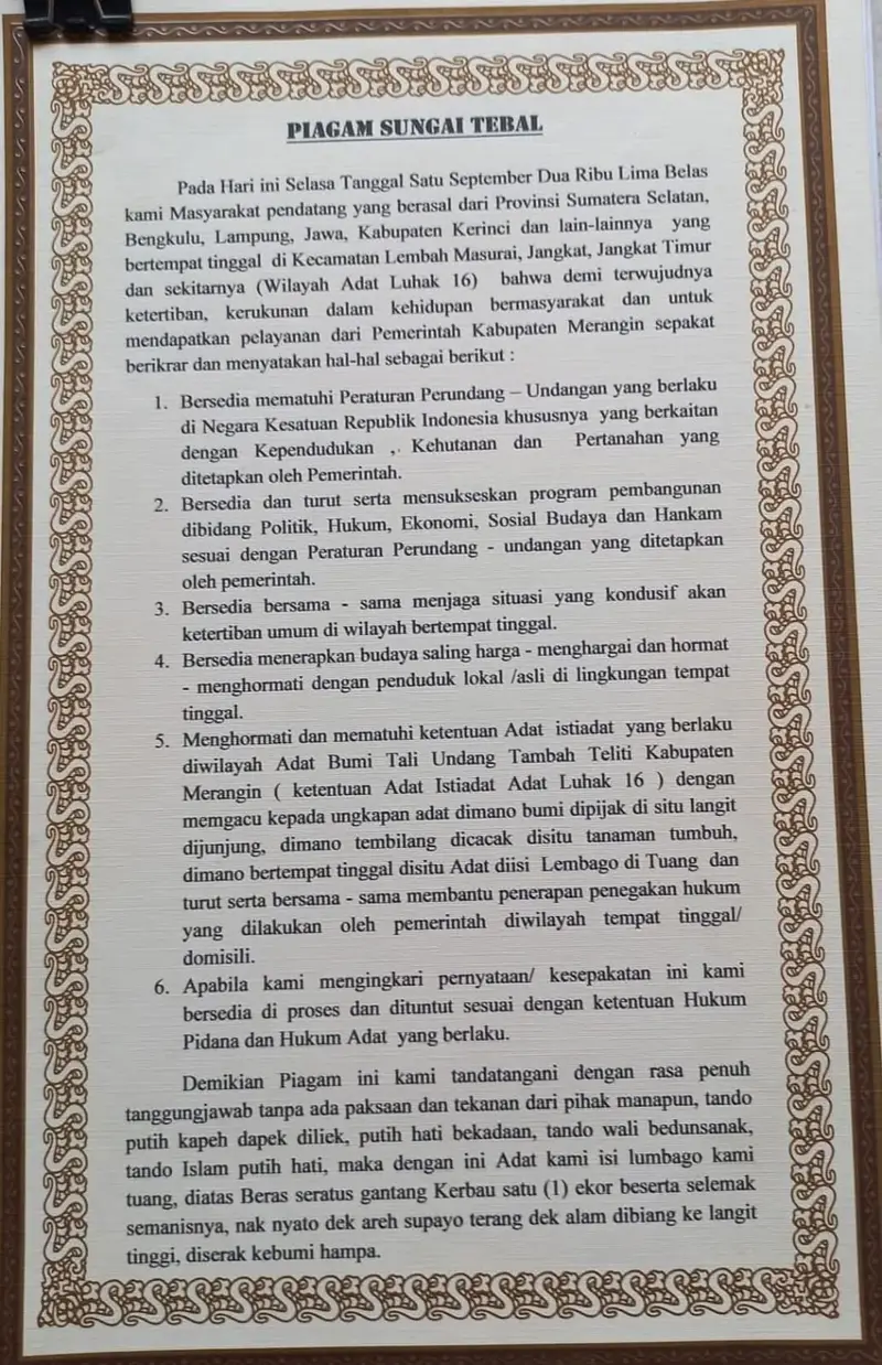Warga Jambi juga mengingatkan bahwa sejak tahun 2015, pihak yang disorot telah menandatangani Pernyataan Piagam Sungai Tebal, yang mengikat secara moral dan hukum sosial.